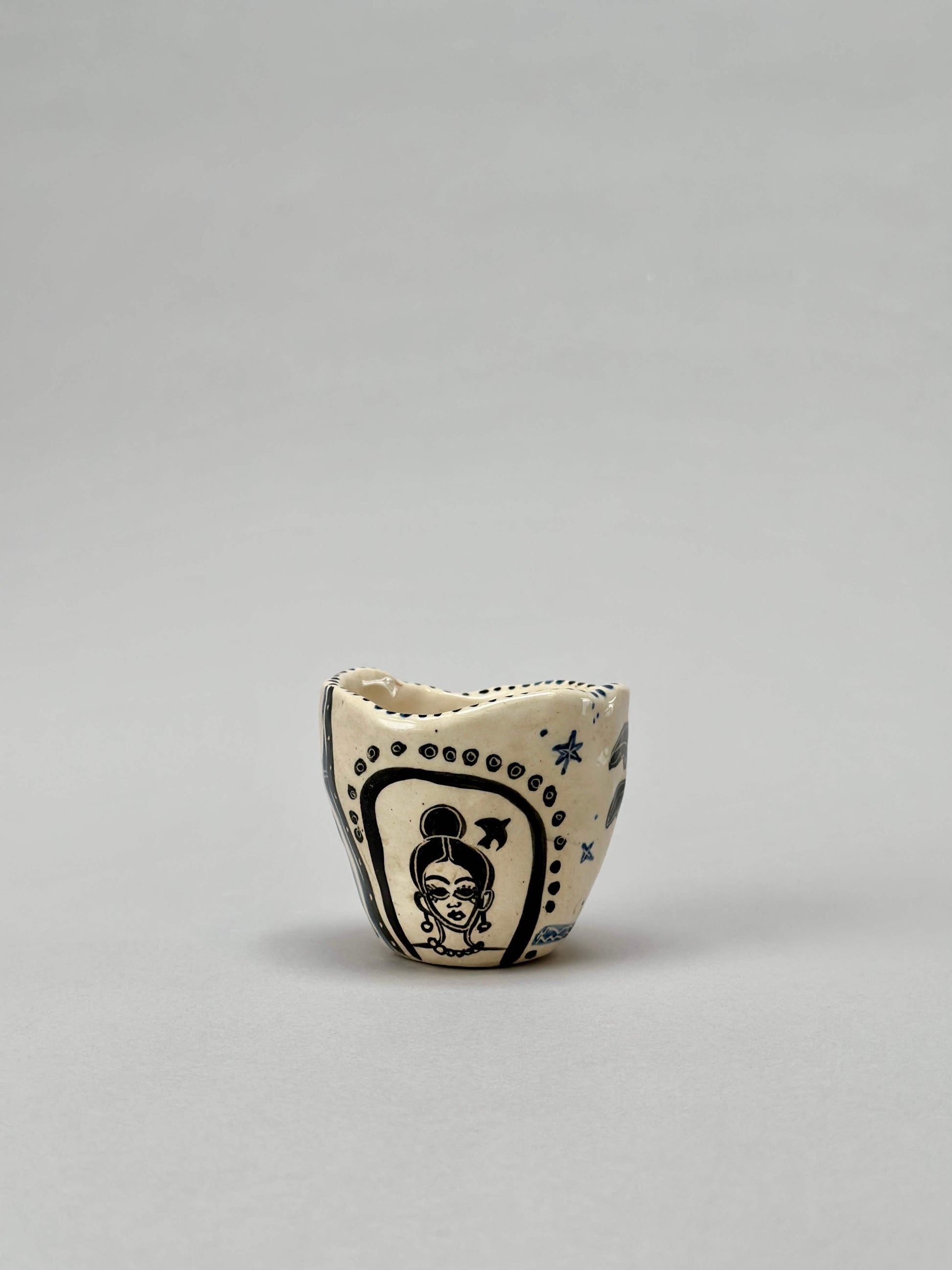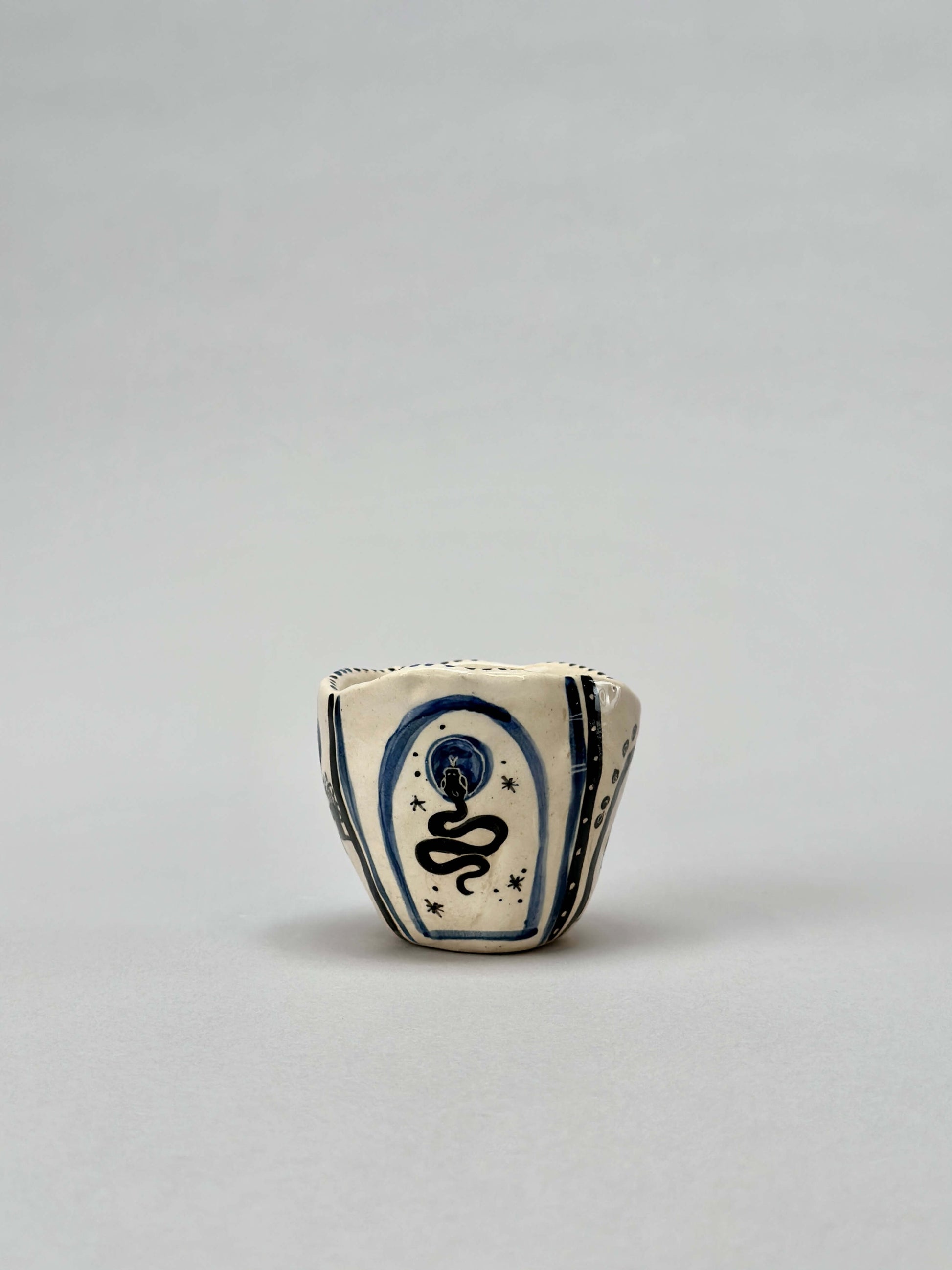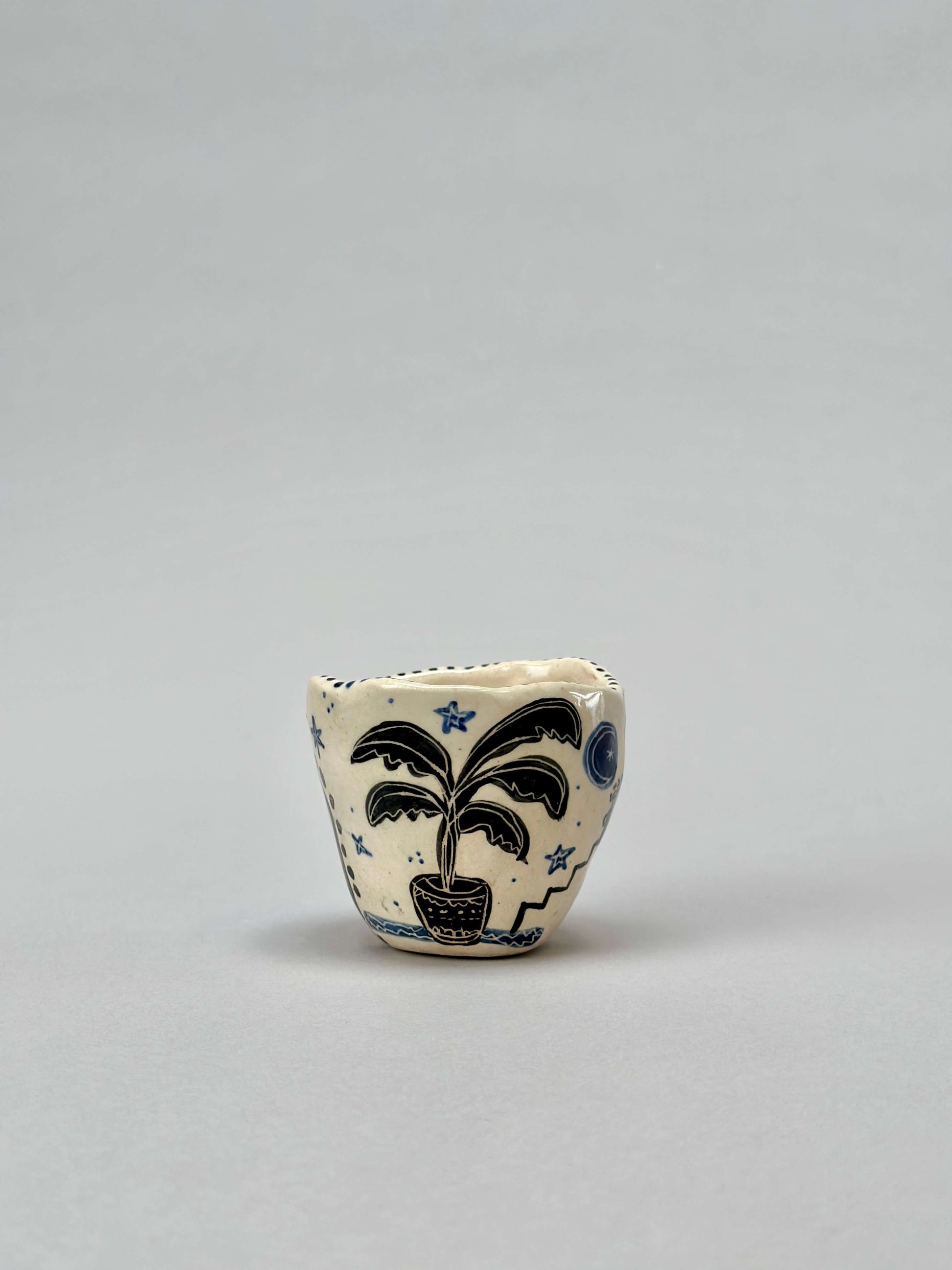 Featured in 2022 Showfields exhibition, “Rebirth: Fantasy visions of the future”; etched and hand painted design features tropical and celestial imagery to create a tiny universe contained within the surface of cup.