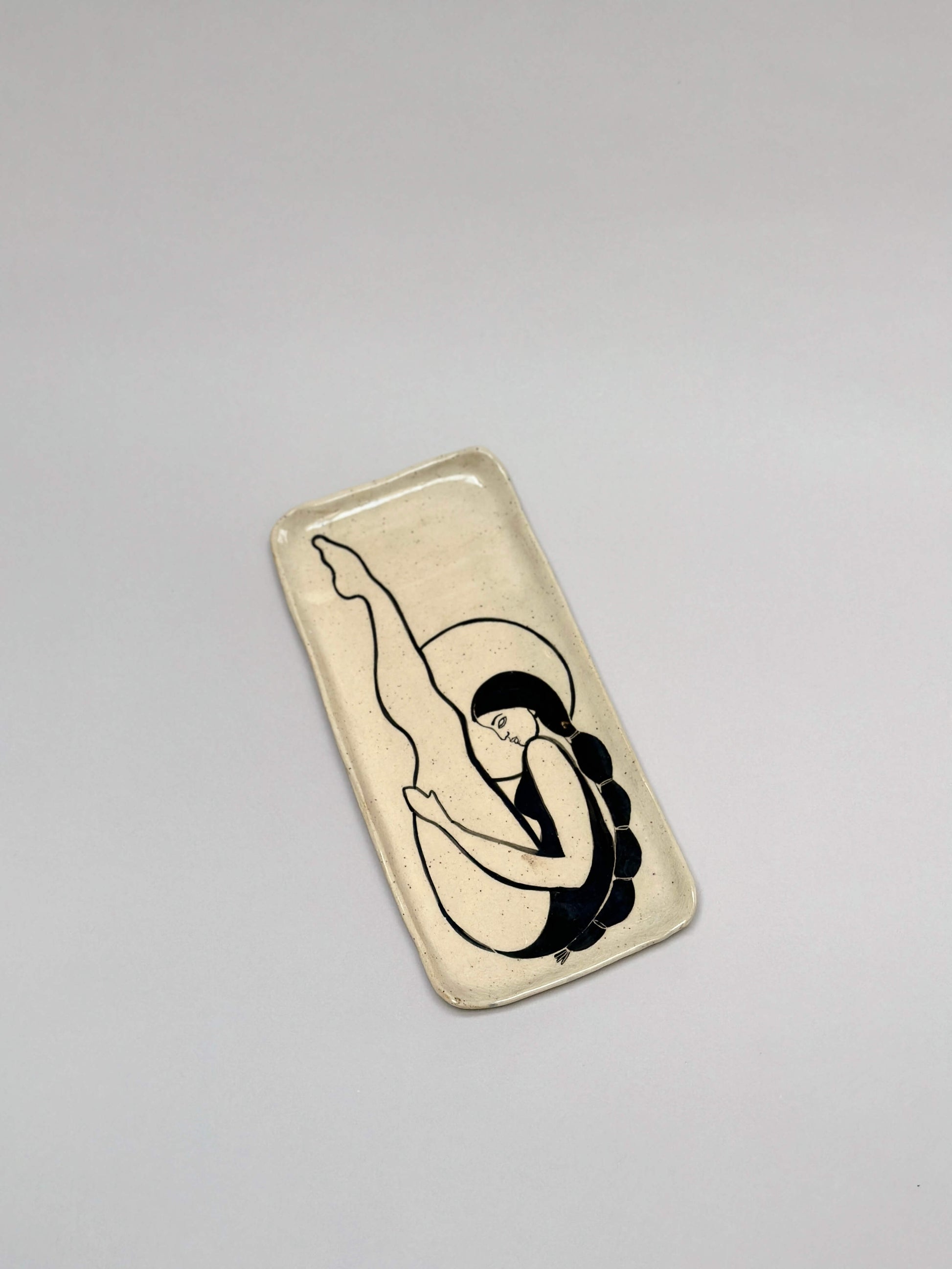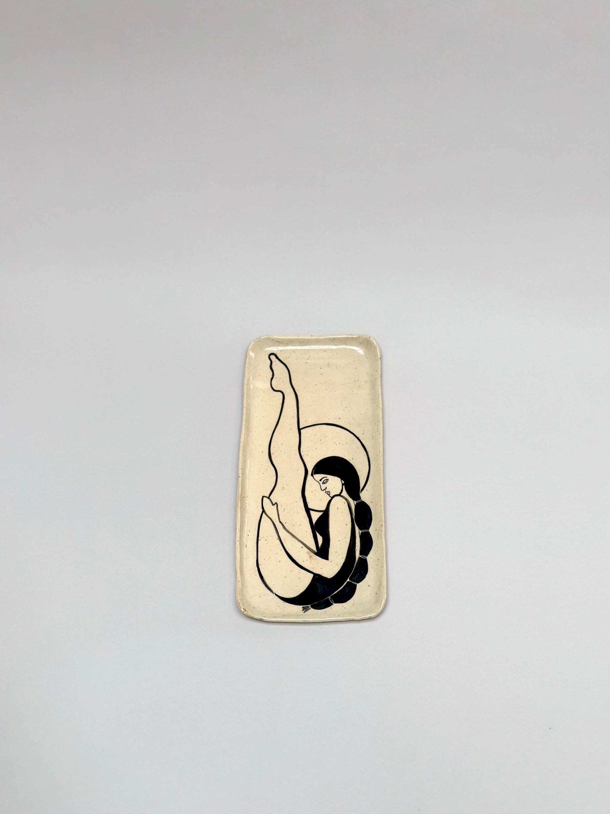 This hand-sculpted white clay decorative tray is etched and hand-painted with black pigments from Deruta, Italy, depicting a self-portrait of the artist relaxing before swimming at the beach. Her hair is braided with her legs outstretched beneath a full sun.